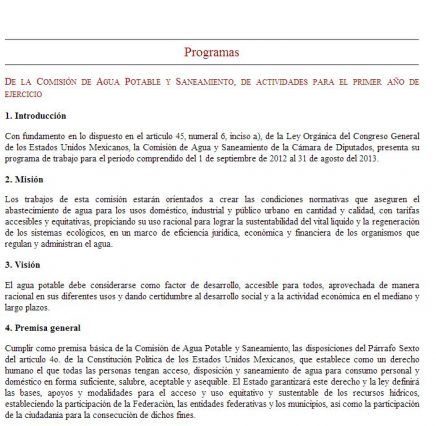 Programa de trabajo de la Comisión de Agua y Saneamiento de la Cámara de Diputados, para el periodo comprendido del 1 de septiembre de 2012 al 31 de agosto del 2013.