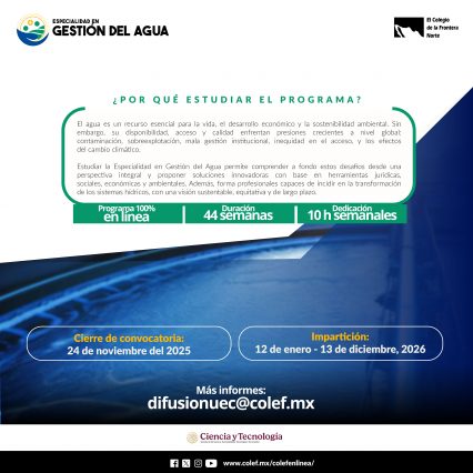 El Colegio de la Frontera Norte (El Colef) lanza convocatoria para la Especialidad en Gestión del Agua (EGA) 100% en línea.