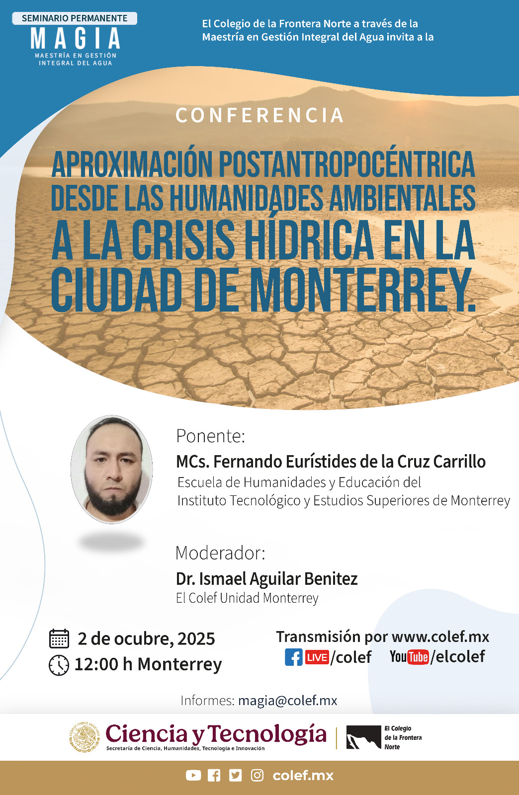 El Colegio de la Frontera Norte (El Colef), invita a la conferencia: “Aproximación postantropocéntrica desde las humanidades ambientales a la crisis hídrica en la ciudad de Monterrey”