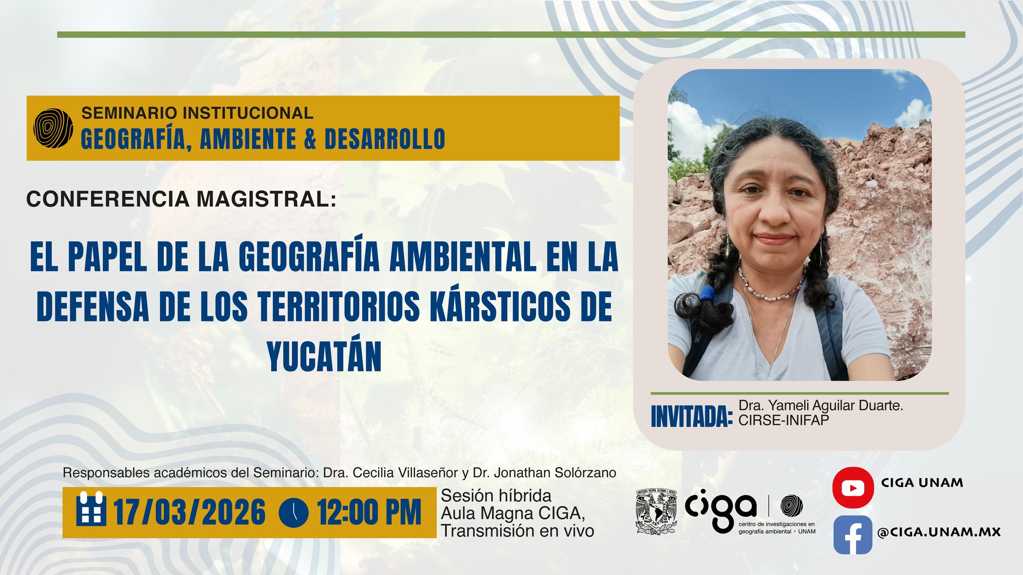 El Centro de Investigaciones en Geografía Ambiental de la UNAM (CIGA-UNAM) te invita a la conferencia magistral “El papel de la geografía ambiental en la defensa de los territorios kársticos de Yucatán”, como parte del Seminario Institucional Geografía, Ambiente & Desarrollo.