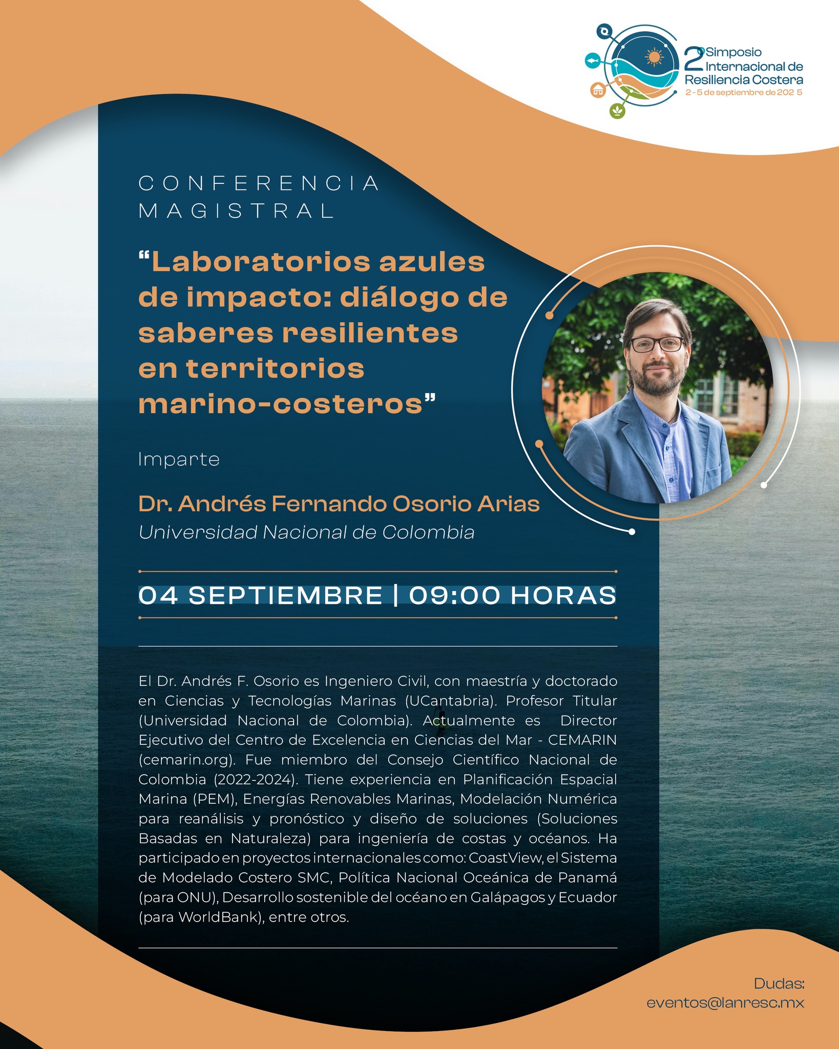 Conferencia magistral “Laboratorios azules de impacto: diálogo de saberes resilientes en territorios marino-costeros”, a cargo del Dr. Andrés Fernando Osorio Arias de la Universidad Nacional de Colombia.