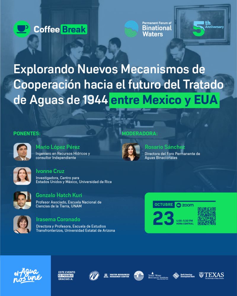 El Foro Permanente de Aguas Binacionales y la universidad de Texas te invitan al Conversatorio: Explorando Nuevos Mecanismos de Cooperación hacia el futuro del Tratado de Aguas de 1944 entre México y EUA, donde se presentarán los ponentes Marío López (Ingeniero en Recursos Hídricos), Ivonne Cruz (Investigadora de la universidad de Rice), Gonzalo Hatch (Profesor de la UNAM) e Irasema Coronado (Directora y Profesora)