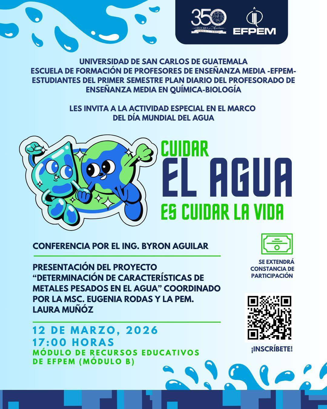 La Universidad de San Carlos de Guatemala, a través de la Escuela de Formación de Profesores de Enseñanza Media (EFPEM), te invita a participar en una actividad especial en el marco del Día Mundial del Agua.