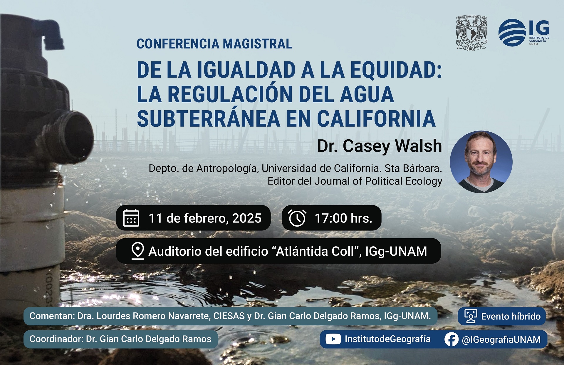 El Instituto de Geografía UNAM les invita a la conferencia magistral “De la igualdad a la equidad: la regulación del agua subterránea en California” con el Dr. Casey Walsh de la Universidad de California.
