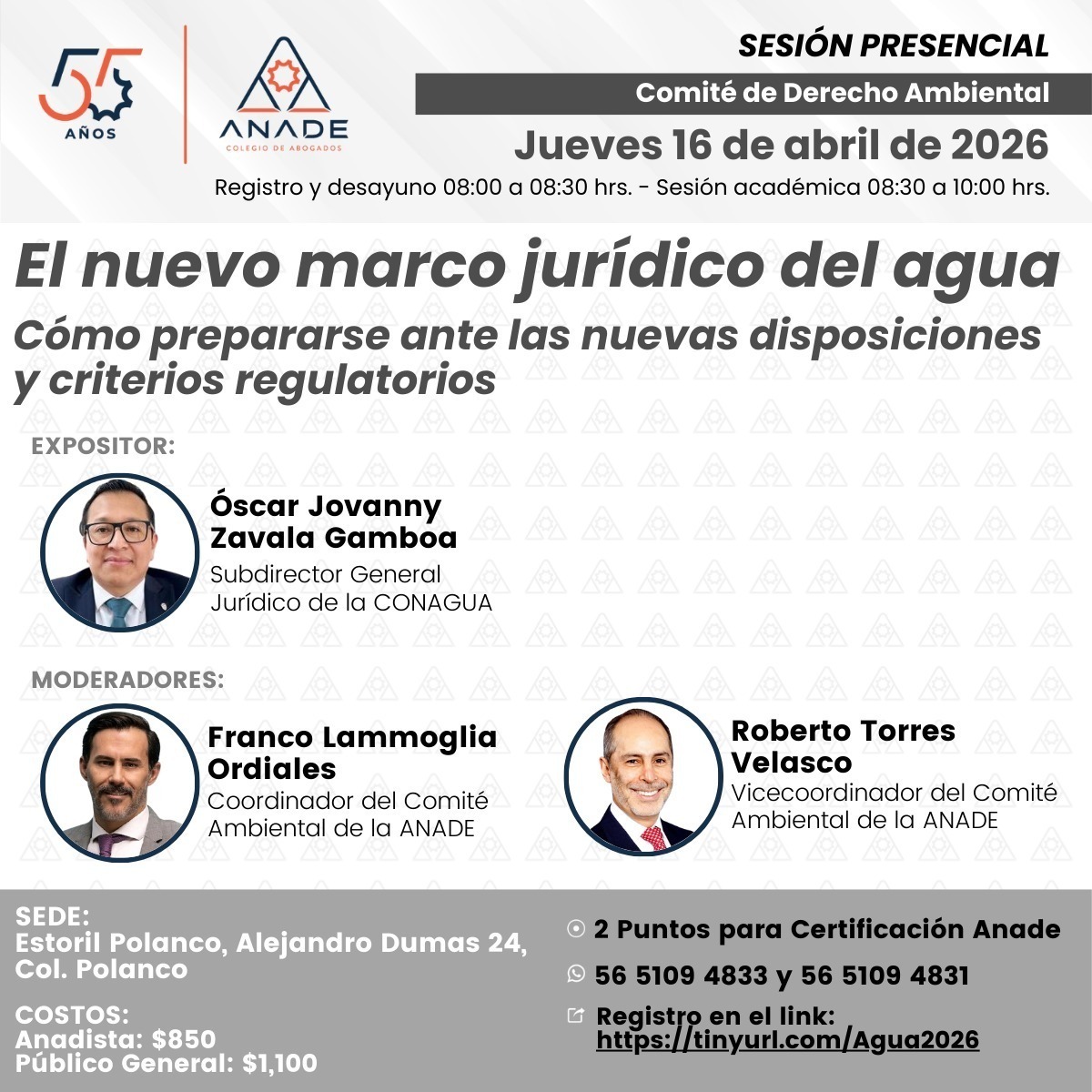 El Colegio de Abogados ANADE, a través de su Comité de Derecho Ambiental, invita a la sesión presencial “El nuevo marco jurídico del agua”, donde autoridades de la Comisión Nacional del Agua abordarán los aspectos más relevantes del nuevo marco regulatorio.