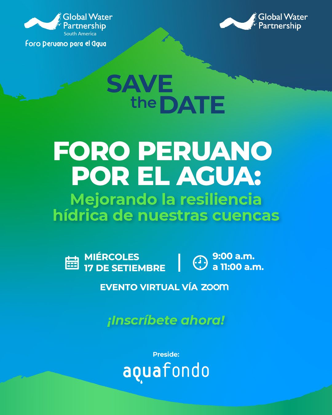 Organizado por Global Water Partnership Sudamérica (GWP Sudamérica), en el marco de la presidencia del Foro Peruano para el Agua – GWP Perú a cargo de Aquafondo – Fondo de Agua para Lima y Callao (2024-2026). Este espacio busca visibilizar avances y desafíos en gobernanza, políticas públicas, restauración de cuencas y seguridad hídrica frente al cambio climático.