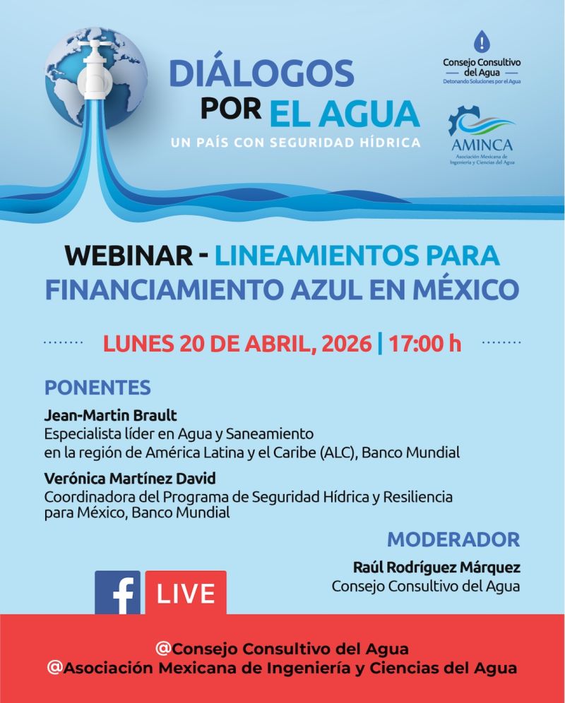 El Dr. Rafael Val Segura, en su calidad de Presidente de AMINCA, tiene el agrado de invitarlos a esta nueva edición de “Diálogos por el Agua”, donde profundizaremos en los “Lineamientos para Financiamiento Azul en México”. Contaremos con la participación excepcional de especialistas del Banco Mundial, quienes nos brindarán una perspectiva global sobre los mecanismos económicos para fortalecer la resiliencia hídrica.