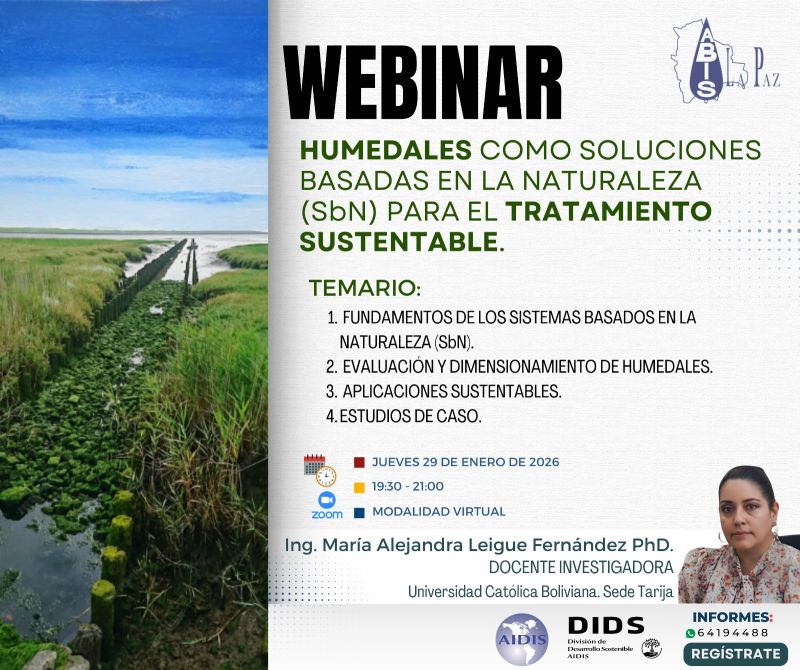 ABIS La Paz invita a profesionales del sector agua y saneamiento a participar en este webinario técnico, orientado a profundizar en los criterios de evaluación, diseño y aplicación de humedales como Soluciones Basadas en la Naturaleza (SbN), en el marco de la ingeniería sanitaria y ambiental.