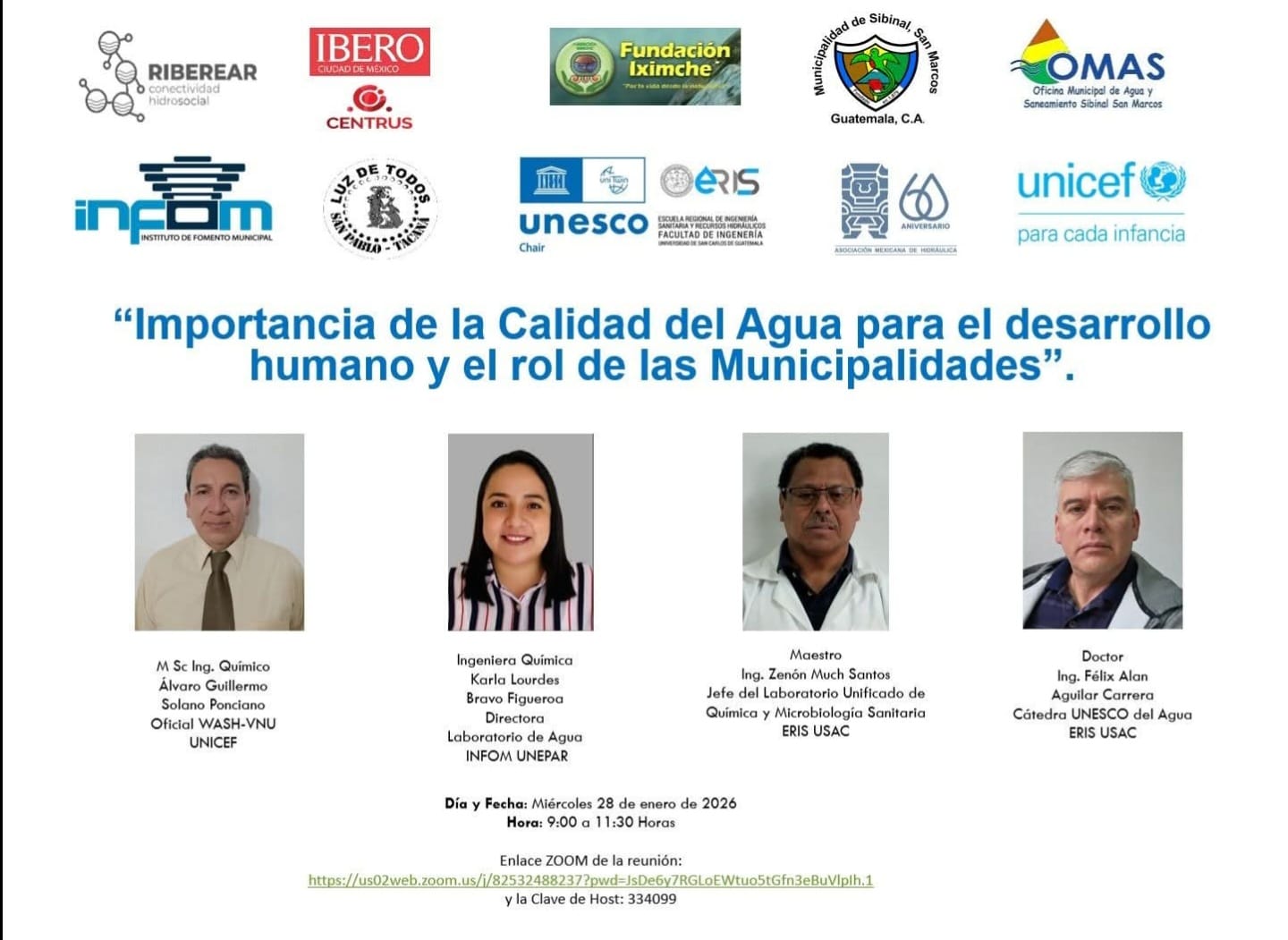 La Cátedra UNESCOLa Cátedra UNESCO para la sostenibilidad de los recursos hídricos en Guatemala, en conjunto con el Instituto de fomento municipal INFOM UNEPAR organizan el conversatorio virtual “Importancia de la calidad del agua para el desarrollo humano y el rol de las municipalidades”.