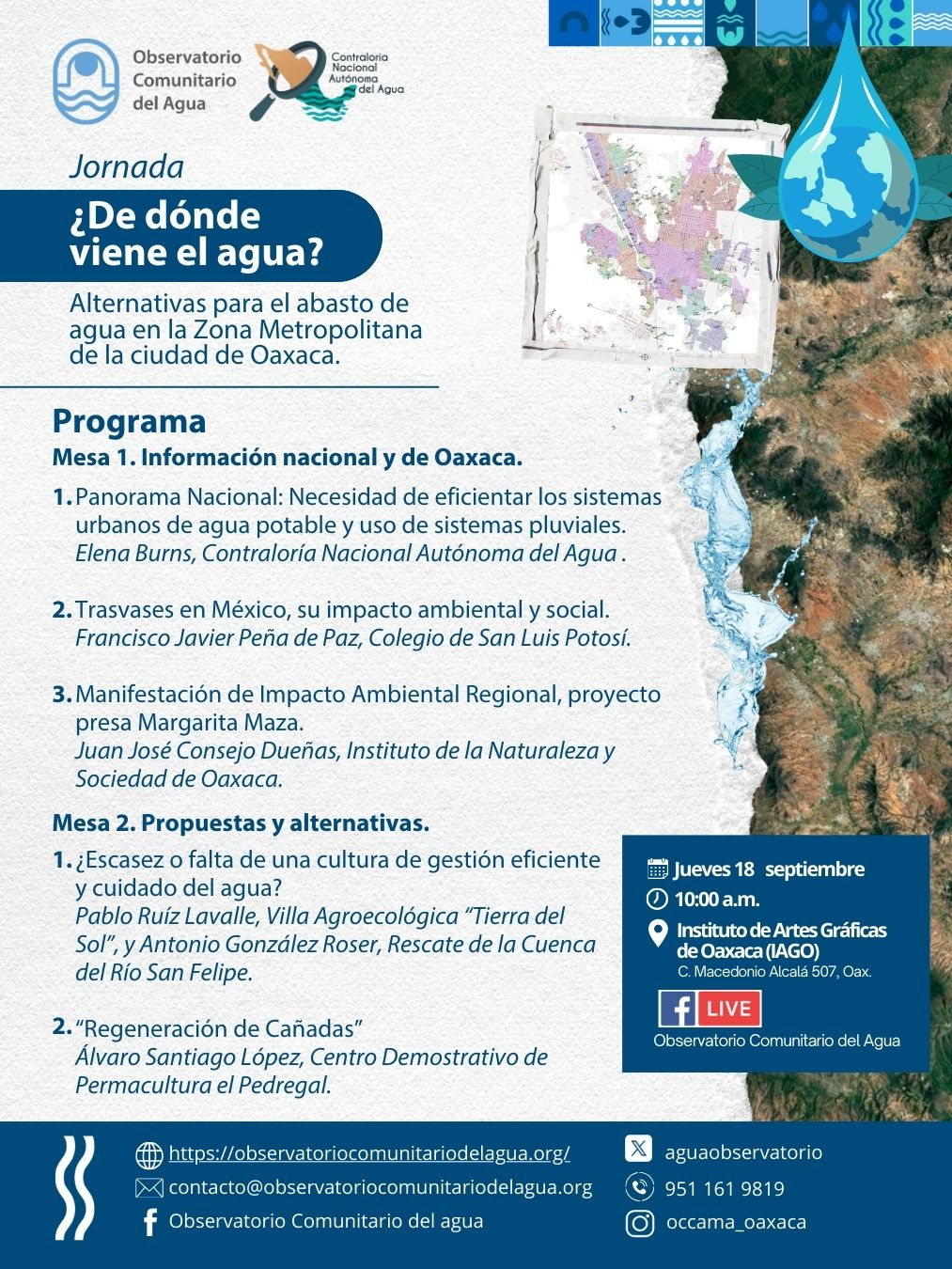 El Observatorio Comunitario del Agua y la Contraloría Nacional Autónoma del Agua invitan a la jornada: “¿De dónde viene el agua? Alternativas para el abasto de agua en la Zona Metropolitana de la ciudad de Oaxaca”