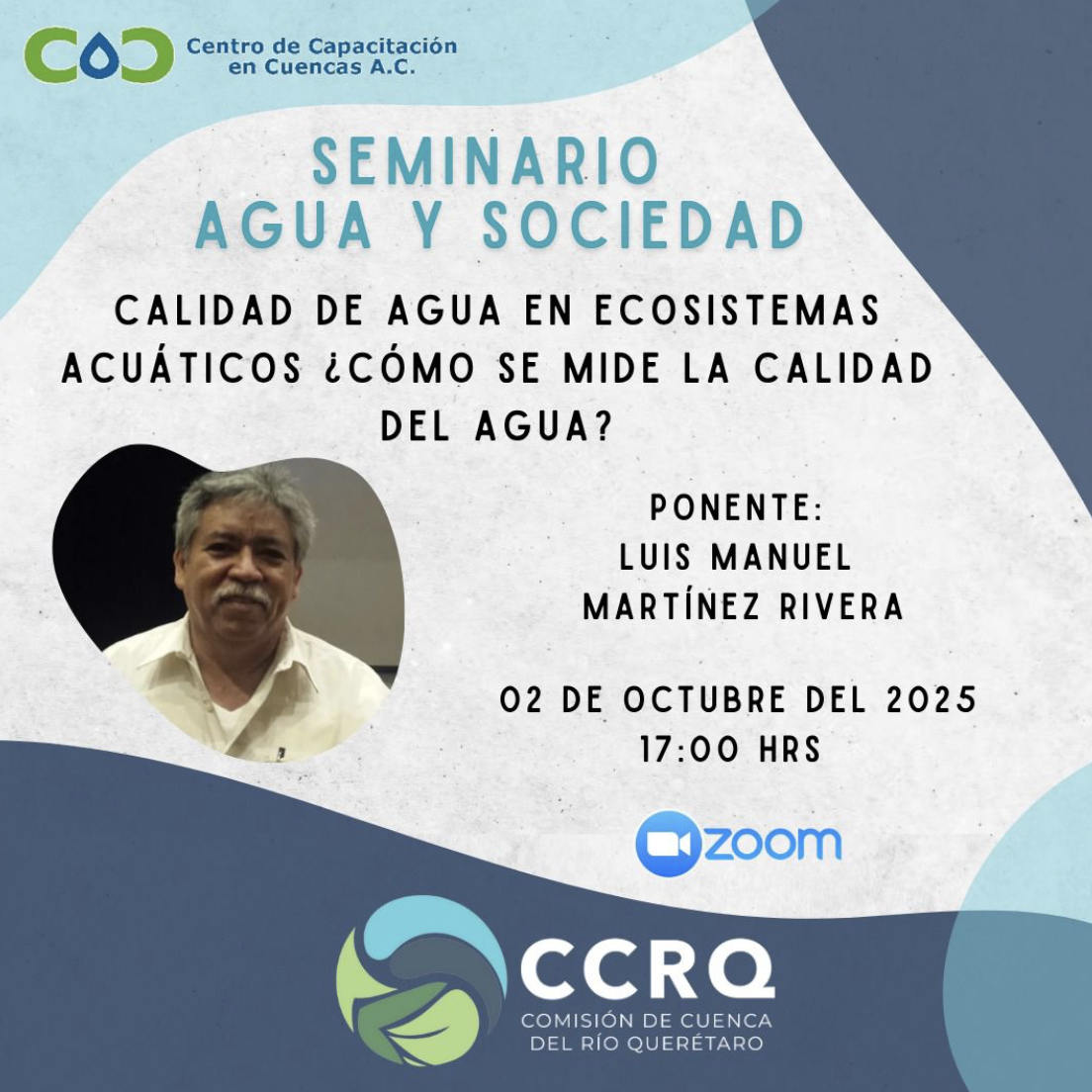 El Centro de Capacitación de Cuencas A.C. y la Red Mexicana de Cuencas invitan a la ponencia Calidad de Agua en Ecosistemas Acuáticos ¿Cómo se mide la calidad del agua? del Seminario Agua y Sociedad.