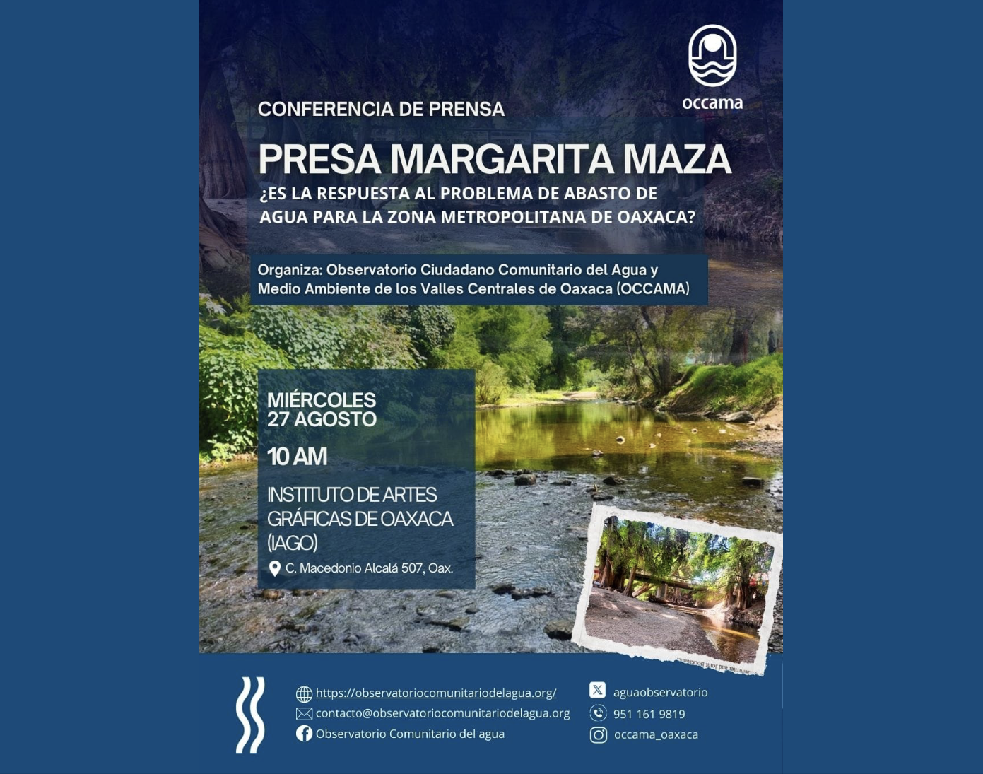 El Observatorio Comunitario del Agua invita a la conferencia de presa para dar a conocer nuestra postura ante el anuncio de la presa Margarita Maza. Les esperamos en el Instituto de Artes Gráficas de Oaxaca (IAGO).