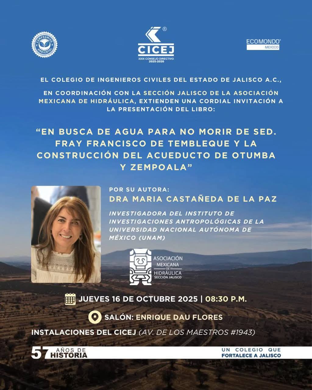 La Asociación Mexicana de Hidráulica, Sección Jalisco, en coordinación con el Colegio de Ingenieros Civiles del Estado de Jalisco (CICEJ), invita a la presentación del libro: “En busca de agua para no morir de sed. Fray Francisco de Tembleque y la construcción del acueducto de Otumba y Zempoala”