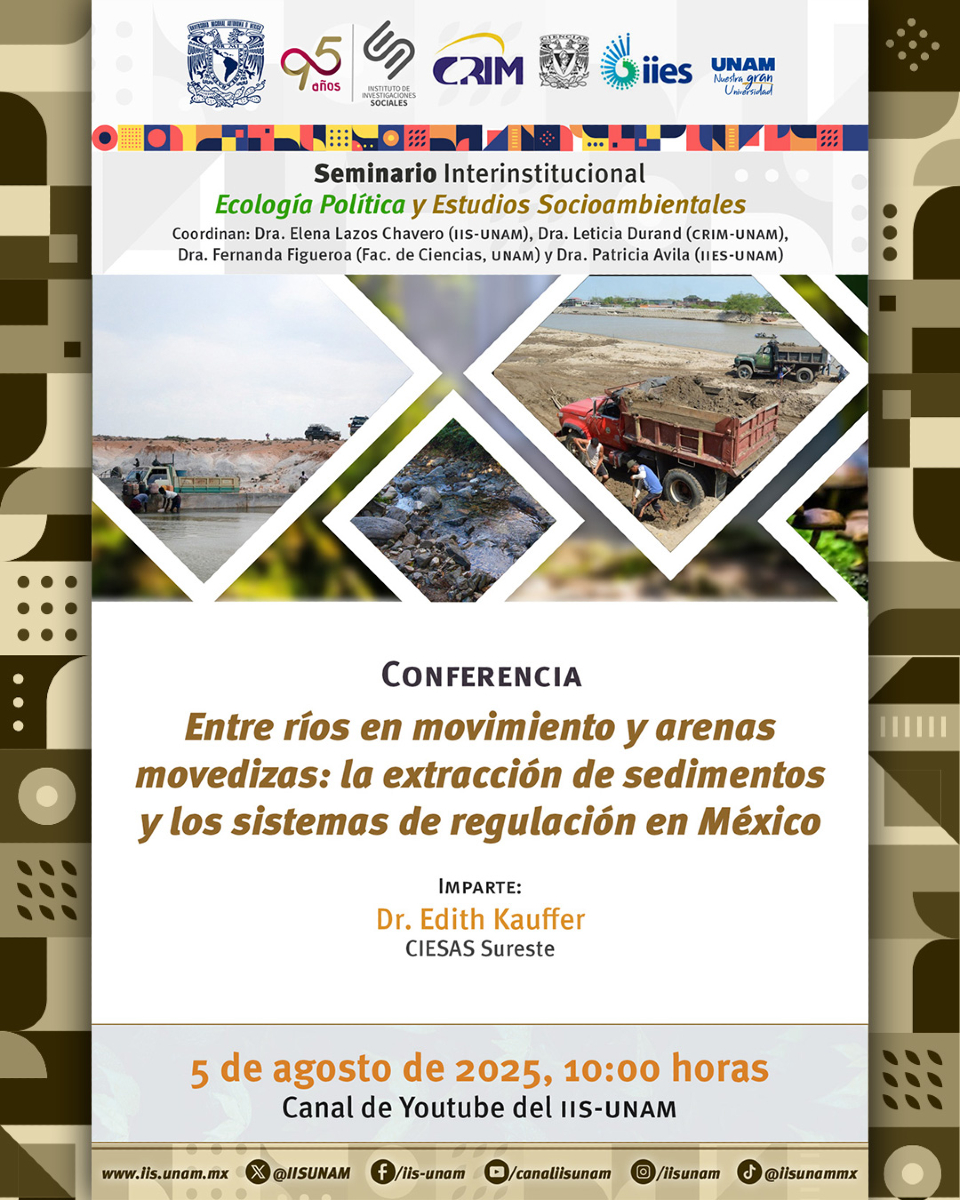 El Instituto de Investigaciones Sociales de la UNAM te invita a su seminario de Ecología política y Estudios socioambientales “Entre ríos en movimiento y arenas movedizas: la extracción de sedimentos y los sistemas de regulación en México”