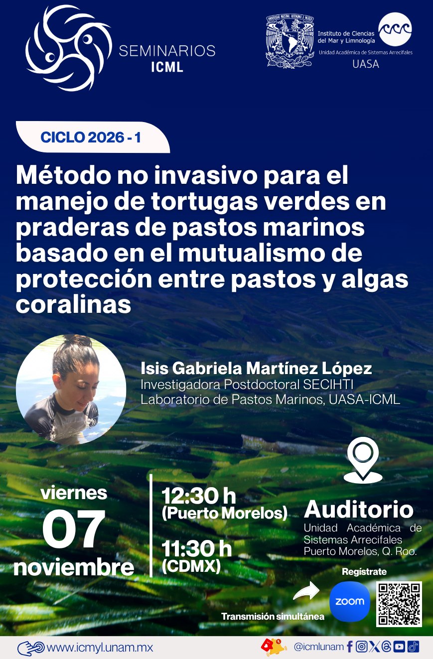 Seminario – Método no invasivo para para el manejo de tortugas verdes en praderas de pastos marinos basado en el mutalismo de protección entre pastos y coralinas (ICML)