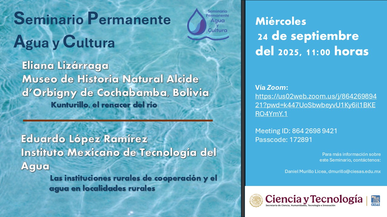 La Secretaría de Ciencias, Humanidades, Tecnología e Innovación invita a las ponencias Kunturillo, el renacer del río y Las instituciones rurales de cooperación y el agua en localidades rurales, las cuales forman parte del Seminario Permanente de Agua y Cultura.