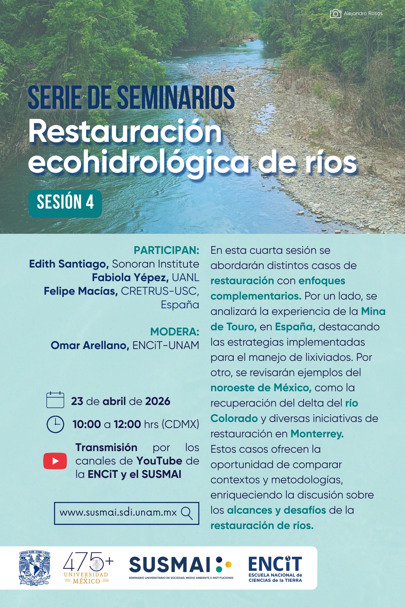 El Seminario Universitario de Sociedad, Medio Ambiente e Instituciones (SUSMAI) en colaboración con la Escuela Nacional de Ciencias de la Tierra (ENCiT) te invita a la cuarta sesión de la serie de seminarios sobre restauración ecohidrológica de ríos. En esta sesión se abordarán diferentes enfoques complementarios de restauración en ríos, con la participación de expertos que compartirán experiencias y retos en la gestión de ecosistemas acuáticos.