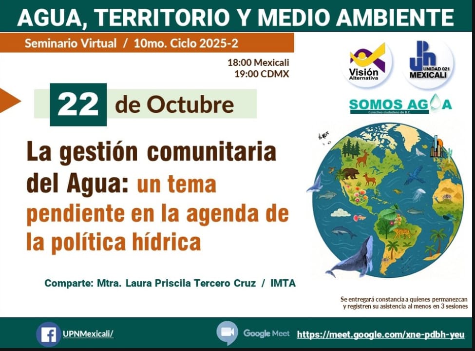 La Universidad Pedagógica Nacional Unidad Mexicali (UPN Mexicali) invita al seminario virtual La gestión Comunitaria del Agua: un tema pendiente en la agenda de la política hídrica. Este seminario forma parte de 10mo ciclo 2025-2 Agua, territorio y medio ambiente.