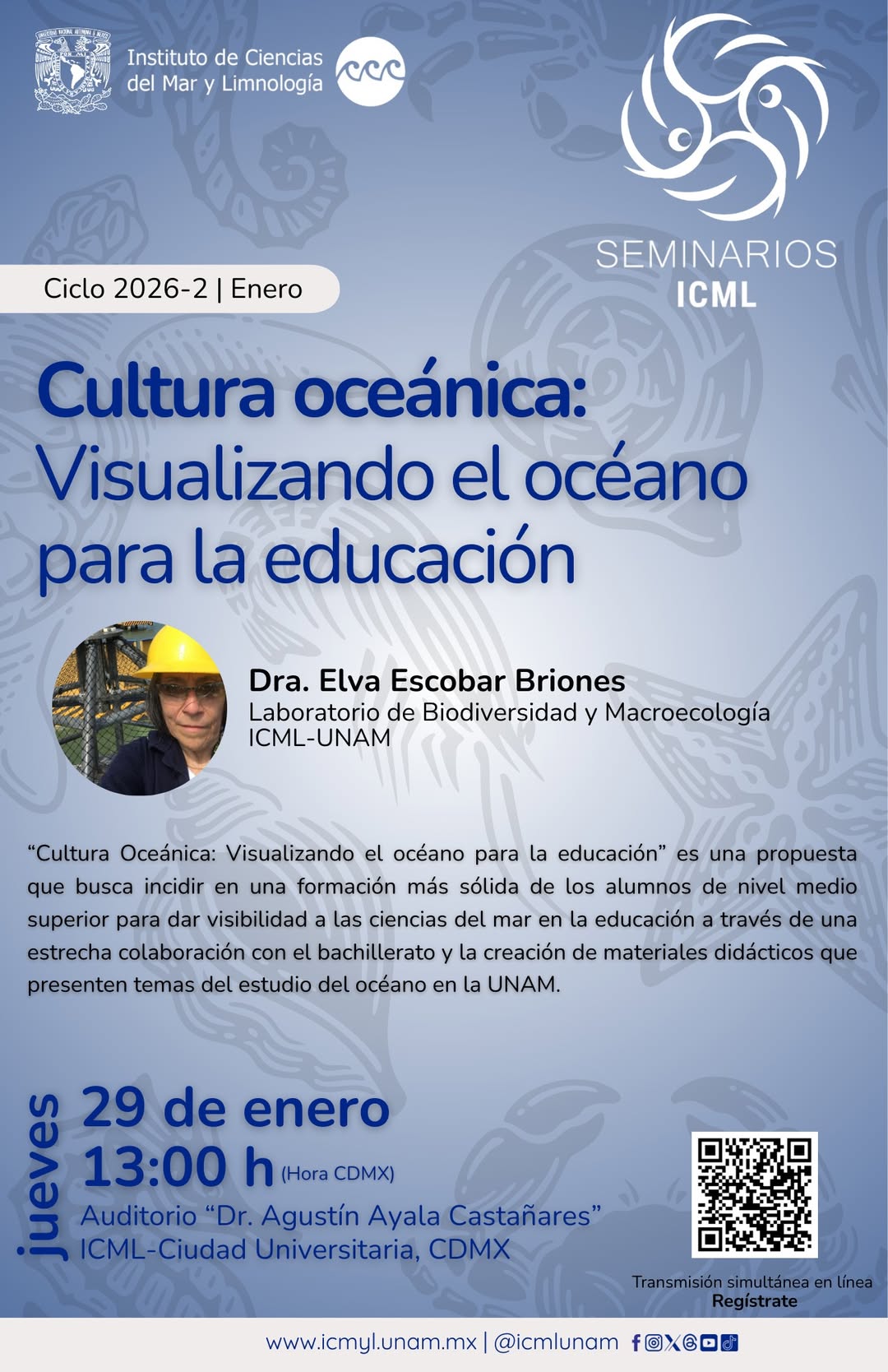 En este nuevo ciclo del Seminarios ICML, iniciara una sesión, a cargo de la Dra. Elva Escobar, para hablar sobre el proyecto PAPIME- DGAPA que se desarrolló durante dos años y se busca darle visibilidad a las ciencias del mar en la educación a nivel medio superior.