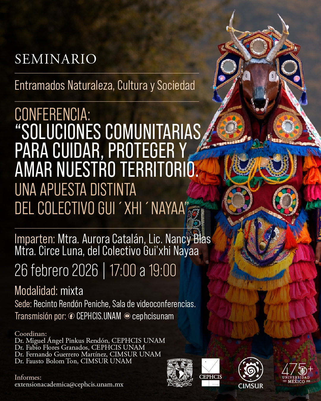 El Centro Peninsular en Humanidades y Ciencias Sociales (CEPHCIS UNAM) invita a la conferencia Soluciones comunitarias para cuidar, proteger y amar nuestro territorio. Una apuesta distinta del Colectivo Gui´Xhi´Nayaa del Seminario: Entramados Naturaleza, Cultura y Sociedad.