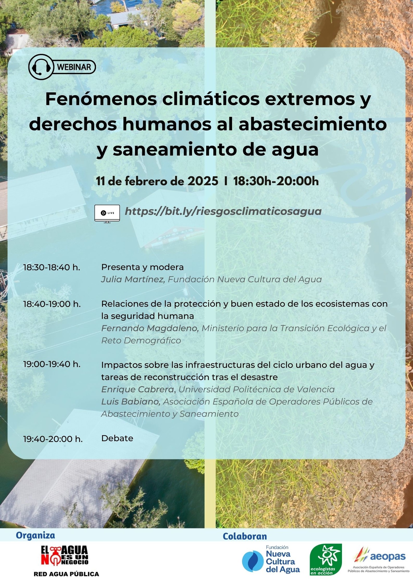 La Red Agua Pública en colaboración con Fundación Nueva Cultura del Agua, Ecologistas en Acción (FNCA) y Asociación Española de Operadores Públicos de Abastecimiento y Saneamiento (AEOPAS) organiza el webinar “Fenómenos climáticos extremos y derechos humanos al abastecimiento y al saneamiento de agua”.