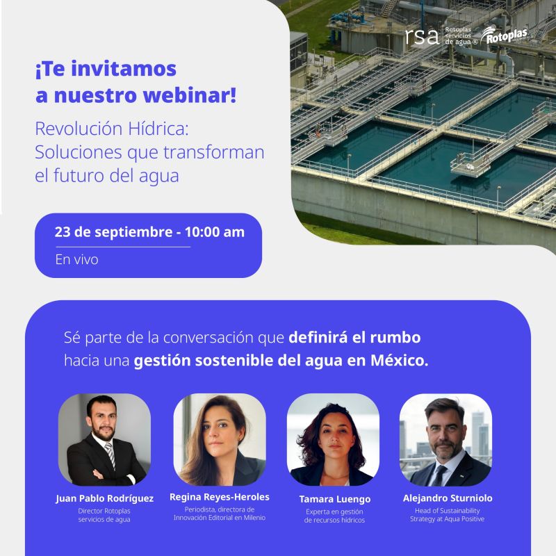 Sus destacados panelistas sonJuan Pablo Rodriguez Romero, Director de Rotoplas Servicios de Agua, Regina Reyes-Heroles, Periodista y Directora de Innovación Editorial en Grupo Milenio, Tamara Luengo Schreck, Experta en gestión de recursos hídricos, Alejandro Sturniolo, Head of Sustainability Strategy en Aqua Positive.
