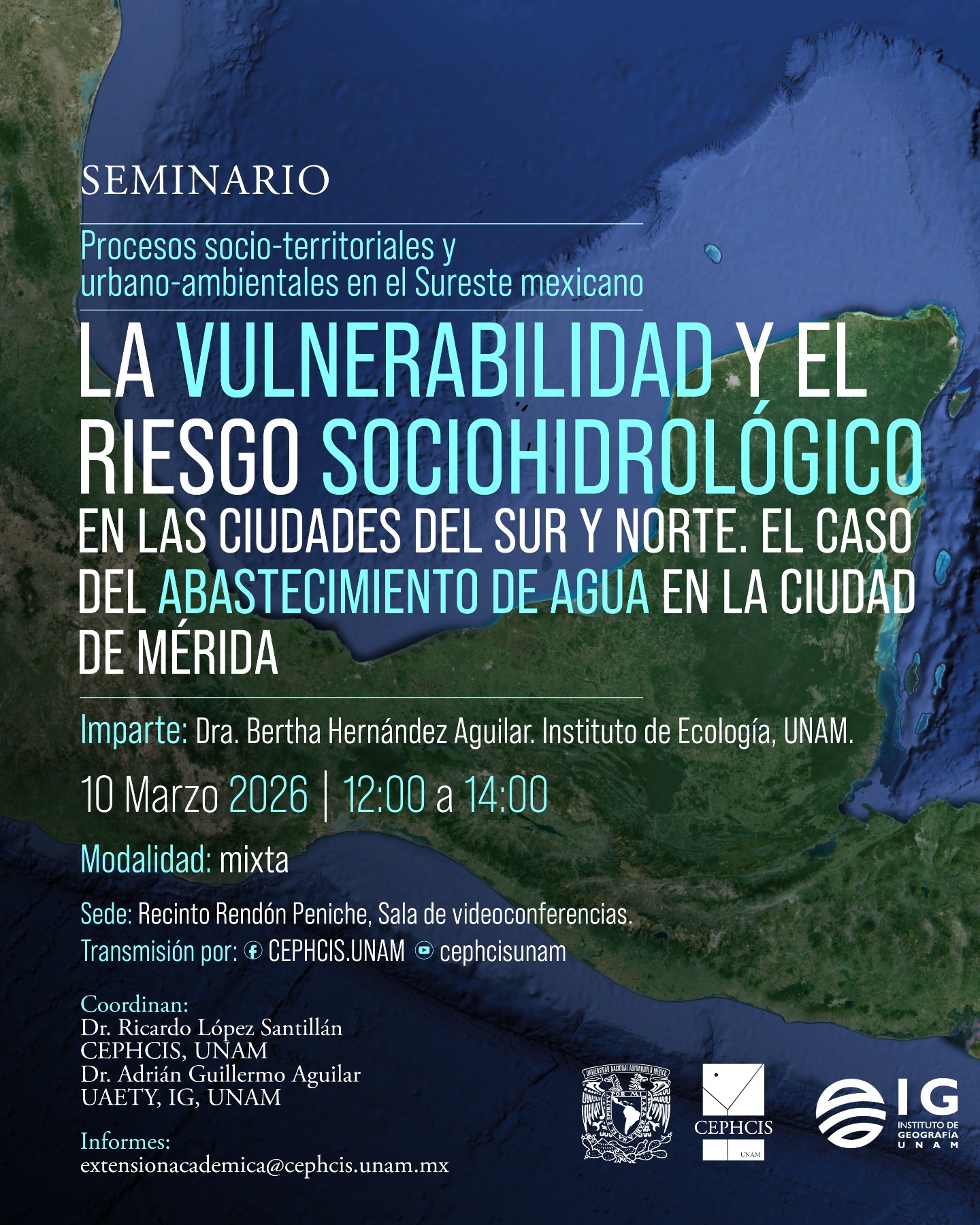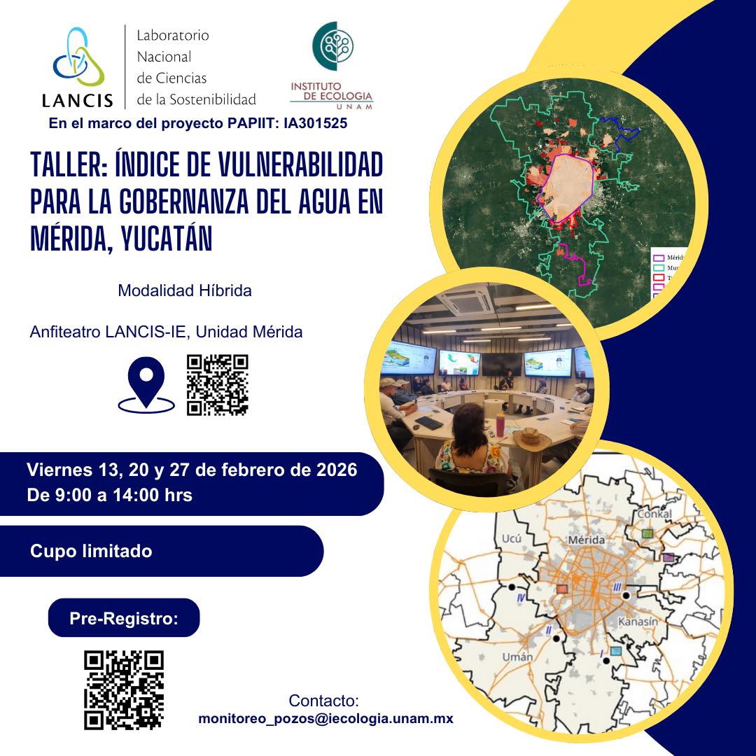 El Instituto de Ecología, UNAM y El Laboratorio Nacional de Ciencias de la Sostenibilidad (LANCIS) te invitan a participar en el taller: Índice de vulnerabilidad para la gobernanza del agua en Mérida, Yucatán. Fecha: Febrero 13, 20 y 27 Horario: 9:00 - 14:00 hrs Modalidad: Híbrido (Anfiteatro LANCIS-IE, Unidad Mérida) ¡Cupo limitado! Contacto: monitoreo_pozos@iecologia.unam.mx Pre-registro … Seguir leyendo TALLER: INDICE DE VULNERABILIDAD PARA LA GOBERNANZA DEL AGUA EN MERIDA, YUCATÁN (Instituto de Ecología, UNAM)