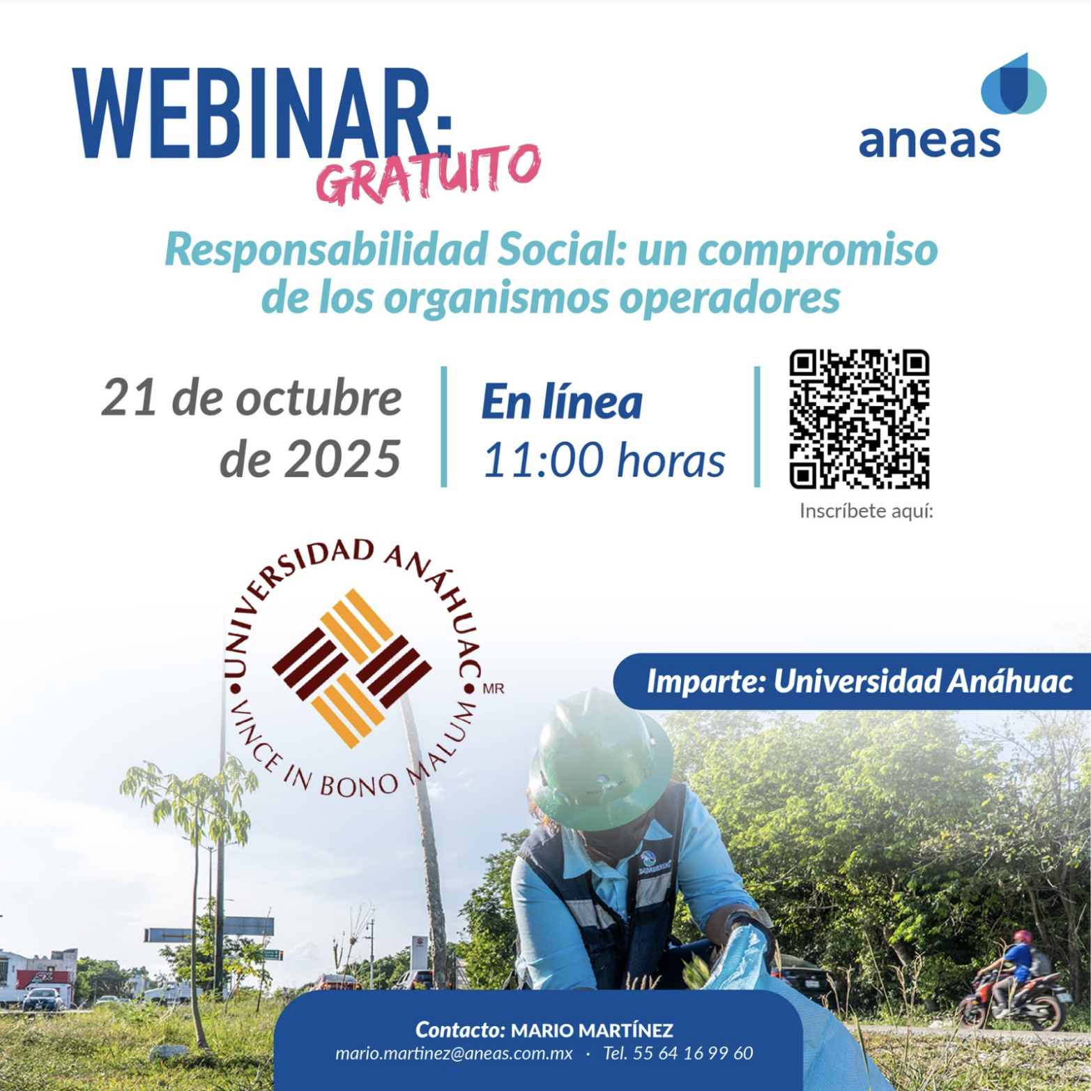 ¡La responsabilidad social también fluye! La Asociación Nacional de Entidades de Agua y Saneamiento (ANEAS) te invita al webinar: Responsabilidad Social: un compromiso de los organismos operadoresParticipa y conoce cómo fortalecer el impacto social del servicio hídrico. Fecha y hora: 21 de octubre de 2025 11:00 horas Imparte: Universidad Anahuac Registro.