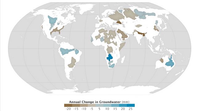 El mapa de arriba muestra la variación anual de almacenamiento de agua subterránea 2003-2013 en los 37 sistemas acuíferos más grandes del mundo. Cuencas que se muestran en tonos marrones han tenido más agua extraída en los años de estudio que podría ser repuesta de forma natural; cuencas en azul muestran aumentos en el almacenamiento del agua subterránea, tal vez debido a los cambios en las precipitaciones, el hielo o la fusión del permafrost, o cambios en las aguas superficiales.