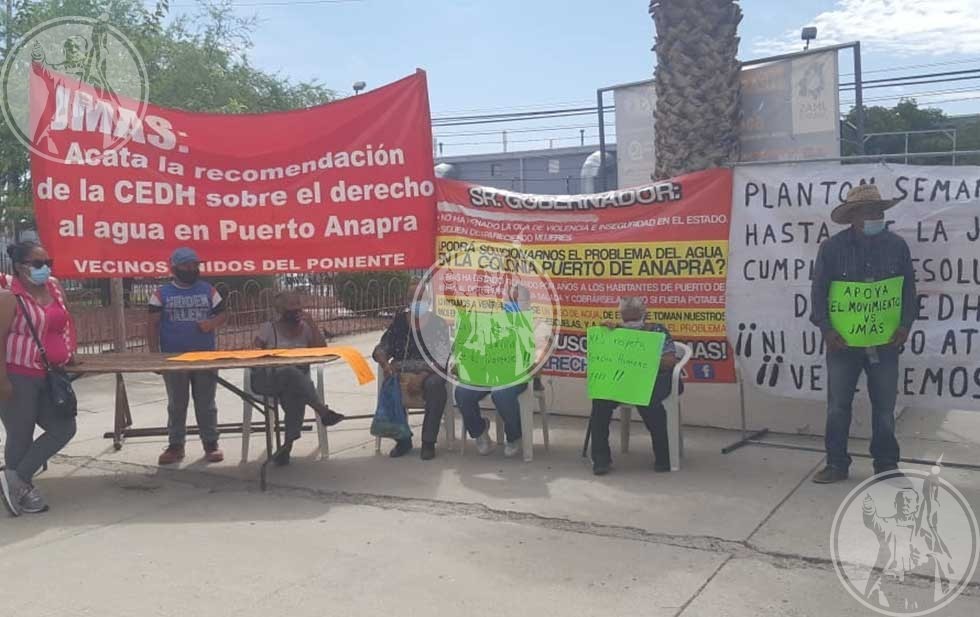Integrantes de la agrupación “Frente del derecho al agua” realizaron un plantón afuera de las oficinas de la JMAS para exigir que se cumpla la recomendación de la Comisión Estatal de Derechos Humanos (CEDH) para la instalación del servicio de líquido potable en Puerto Anapra.