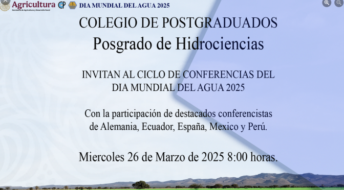 El Colegio de Postgraduados les invita a: Al ciclo de conferencias del Día mundial del agua de 2025. Con la participación de destacados conferencistas de Alemania, Ecuador, España, México y … Seguir leyendo Conferencias del día mundial del agua (Colegio de postgraduados) →